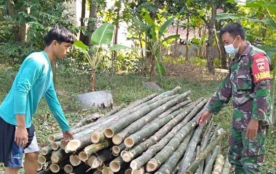 Pati – Untuk pengerjaan rehab rumah warga di Desa Tamansari, Satgas TMMD Reguler Ke-111 bersama warga bersinergi mencari bambu untuk dijadikan mall penyangga rumah yang akan di rehab, Kamis (10/06/2021).