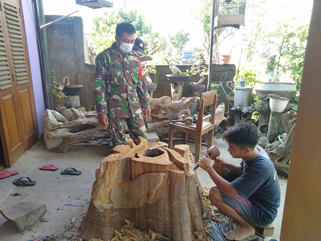 PATI – Prajurit Satgas TMMD Kodim Pati menyempatkan diri untuk bertandang ke rumah rumah kerajinan ukir dan meubel yang ada di Desa Tamansari, Kecamatan Jaken, Kabupaten Pati, terutama kerajinan tangan ukir kayu abstrak meskipun kini sudah banyak peralatan mesin ukir canggih.