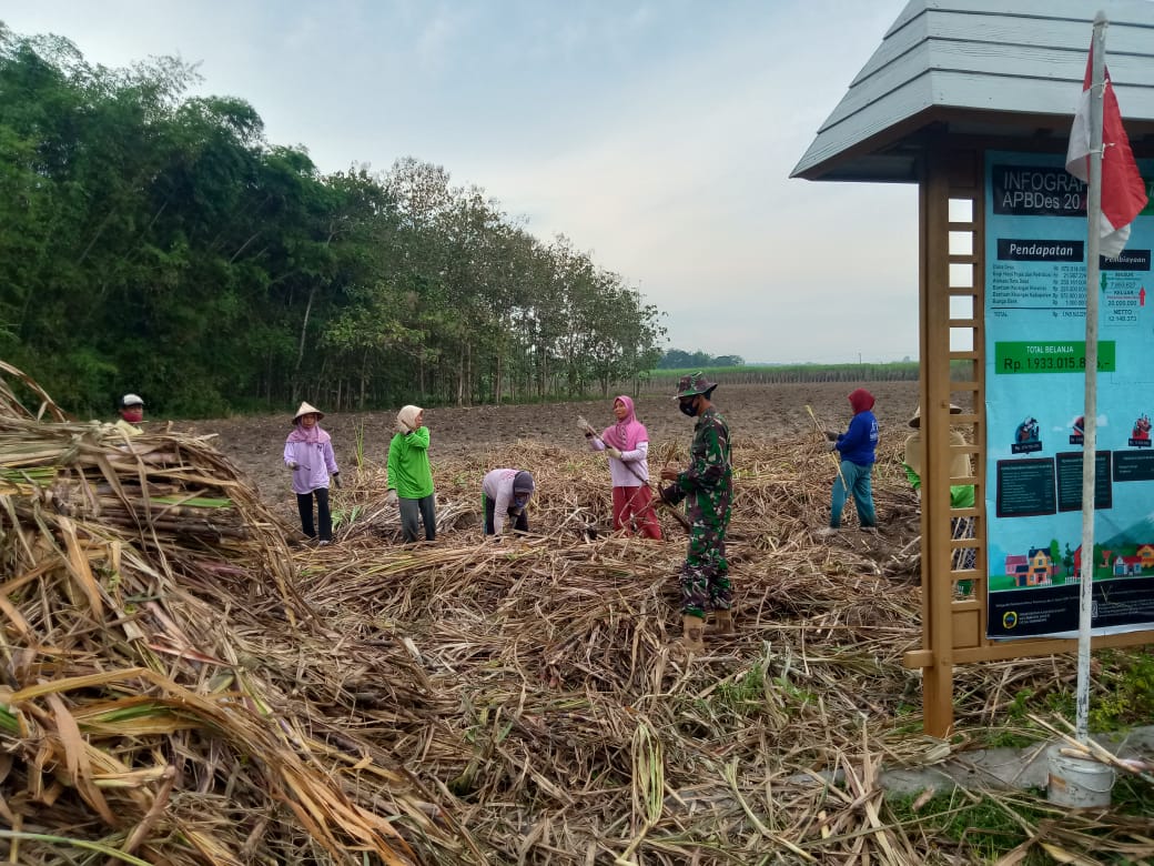 Pati-Untuk mengilangkan kejenuhan serta penat disela kegiatan TMMD regular 111. Kodim Pati, salah satu anggota satgas menyambangi lahan tebu milik Lajan salah satu warga Tamansari yang sedang melaksanakan panen.Senin,(14/06/2021).