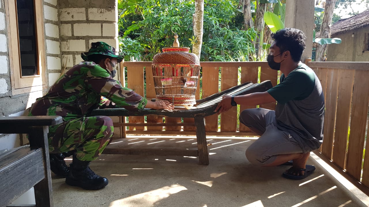 Disela istirahat anggota satgas TMMD Sertu Toha Untoro menyempatkan diri berkunjung di kediaman Totok dengan harapan dapat menerap ilmu usaha beternak burung perkutut yang ditekuninya, Senin (14/06/2021).