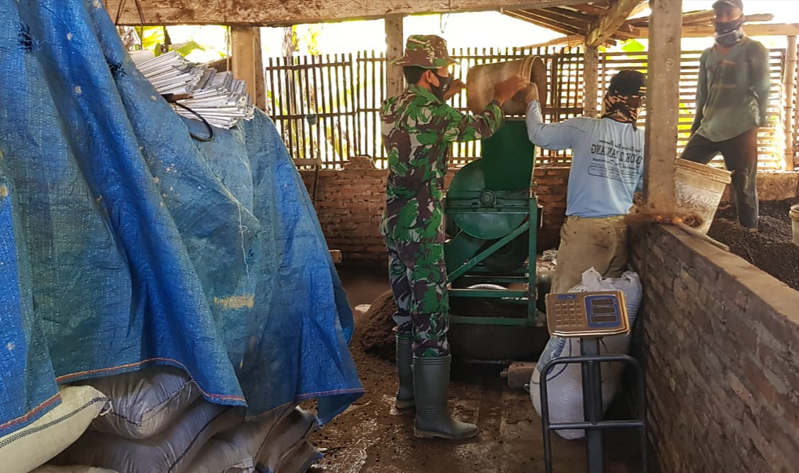 Kali ini terlihat Serda Sukarji anggota Satgas TMMD Reguler Kodim Pati membantu Bapak Sugiman (61) warga Dukuh Kemiri, Desa Tamansari, Kecamatan Jaken, Kabupaten Pati, dalam pembuatan Kompos untuk dijual sebagai pupuk organik yang biasa di gunakan warga Desa Tamansari dan sekitarnya, Jum’at (02/7/2021).