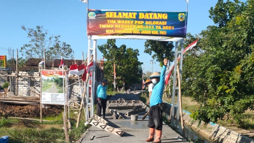 Pati – TMMD reguler ke 111 Kodim 0718/Pati di Desa Tamansari, Kecamatan Jaken, Kabupaten Pati saat ini pada pekerjaan pembangunan jalan betonisasi sepanjang 1.450 meter yang menghubungkan antara Desa Tamansari menuju Desa Sumberarum untuk pengecoran beton telah selesai penggarapannya. Namun untuk bekisting yang blom dicopot hari ini satgas TMMD dibantu masyarakat melaksanakan pencopotan papan bekisting dan kemudian dikumpulkan disimpan kembali.