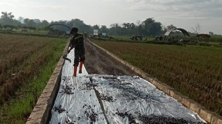 Praka Abdul Hamid anggota dari satuan Yon Zipur 4/TK yang tergabung dalam satgas TMMD reguler ke 111 Kodim 0718/Pati, tampak sedang sibuk menggunakan cangkul yang digunakan untuk membawa adonan cor, yang akan ia tempatkan di sejumlah titik pada bagian atas plastik cor supaya menghindari sewaktu angin kencang datang.