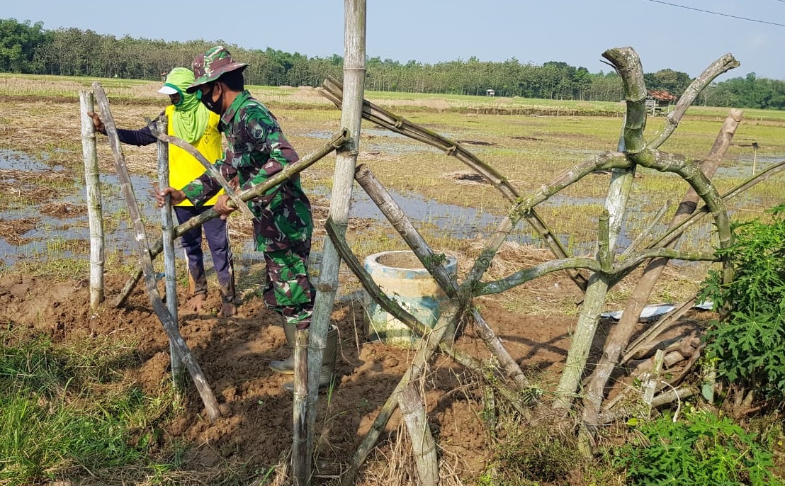 Kodim 0718/Pati yang melihat warga sedang membuat pagar rambatan tanaman oyong atau gambas dibagian pematang sawah. Seketika itu