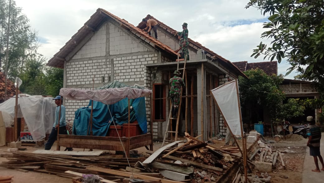 Pati – Satgas TNI Manunggal Membangun Desa (TMMD) Reguler Ke-111 Kodim 0718/Pati, bersama dengan warga memasang genteng Rumah Tidak Layak Huni (RTLH) milik Yono (60) warga Dusun Pandahan, Desa Tamansari, Kabupaten Pati. Jumat (25/6/2021)