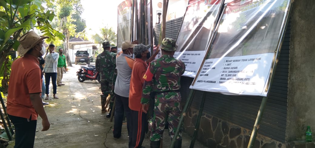 Pati-Antusiasme warga desa Tamansari kecamatan Jaken kabupaten Pati terlihat hari ini anggota satgas TMMD Kodim Pati bersama warga desa Tamansari, kades serta perangkat desa kompak melaksanakan pemasangan baliho dan papan pamplet di lokasi sasaran fisik TMMD.Minggu,(13/06/2021).