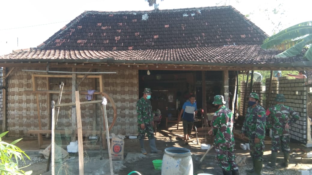Pati-Rumah Sutiah salah satu penerima bantuan rehab RTLH sampai hari ini sudah terlihat tembok berdiri disamping rumah setinggi 2 meter yang merupakan hasil kerjasama gotong-royong warga bersama satgas TMMD Reg.111 Kodim Pati. Senin,(07/06/2021).