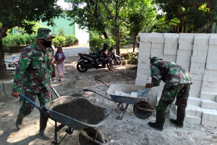 Pati – Salah satu Satgas TMMD 111 Kodim 0718/Pati semangat mengangkat bahan material pasir dan bata untuk pembangunan RTLH milik Rusnawi (68) Dusun Kalimati RT.04 RW.01 Desa Tamansari Kecamatan Jaken.