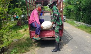 Pati – Salah satu Satgas TMMD 111 Kodim 0718/Pati semangat mengangkat bahan material pasir dan bata untuk pembangunan RTLH milik Rusnawi (68) Dusun Kalimati RT.04 RW.01 Desa Tamansari Kecamatan Jaken.