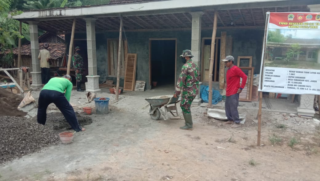 Pati – Kegiatan rehab Rumah Tidak Layak Huni (RTLH) dalam Program TNI Manunggal Membangun Desa (TMMD) Reguler Ke-111 Kodim 0718/Pati TA.2021 sudah berjalan lebih kurang dua minggu. Kegiatan pengecoran jalan dan rehab Rumah Tidak Layak Huni (RTLH), di Desa Tamansari, Kecamatan Jaken, Kabupaten Pati masih terus berlanjut setiap hari.