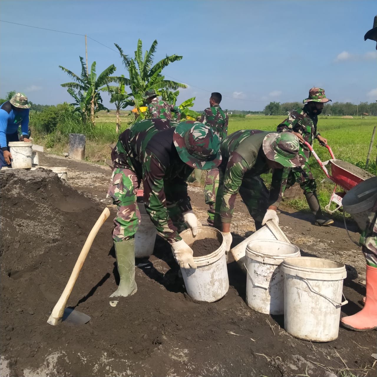 Jalan desa di Desa Tamansari Kecamatan Jaken Kabupaten Pati yang menjadi sasaran program kegiatan TNI manunggal Membangun Desa (TMMD) Ke 111 Kodim 0718/Pati terlihat begitu ramai dipadati anggota TNI dan warga.