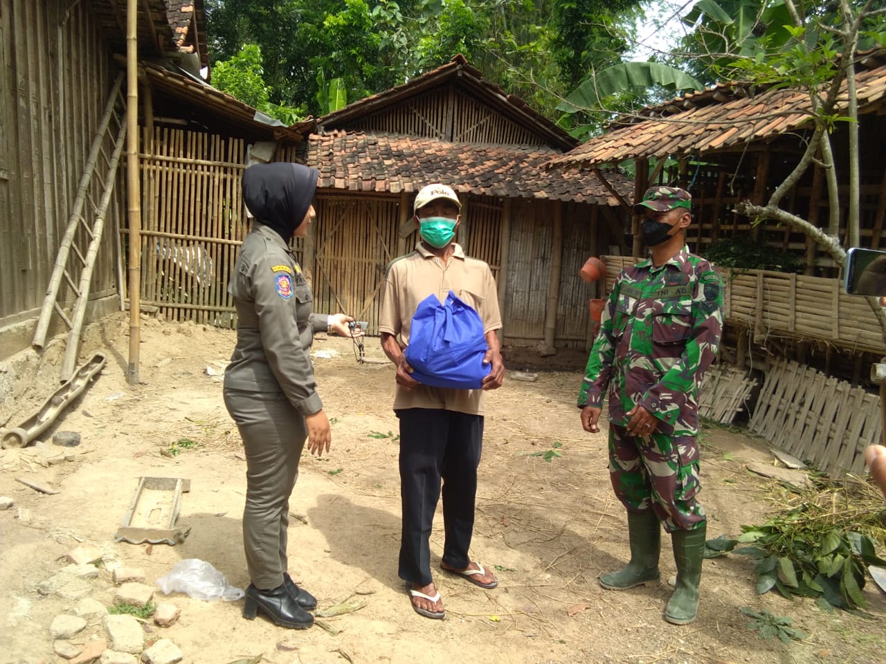Pati – Pemandangan yang menyejukkan bagi orang yang melihatnya ketika seorang anggota Satpol-PP Cantik menyerahkan paket sembako untuk Bapak Daryanto (60) warga RT.03/02 Desa Tamansari, Kecamatan Jaken, Kabupaten Pati, Jawa tengah, tempat digelarnya kegiatan TMMD Reguler Kodim Pati. Adapun paket sembako yang diberikan kepada warga Desa Tamansari yang terdampak pandemi Covid-19 ini hasil kerjasama Pemerintah daerah Kabupaten Pati dengan Satgas TMMD Reguler ke-111 Kodim 0718/Pati.