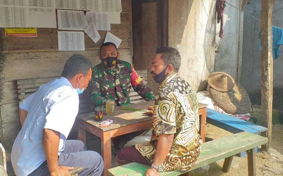 Pagi-pagi sebelum menuju lokasi sasaran kegiatan fisik TMMD, Serda Nur Roikhin nampak sedang menikmati teh panas seraya bercerita kepada warga yang kebetulan juga sedang menikmati kopi, Kamis (10/6/2021).