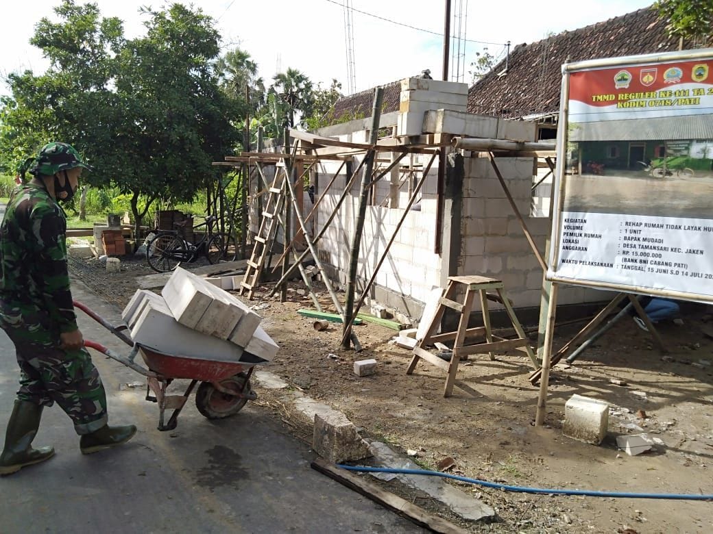 Pati – Dengan menggunakan gerobak dorong jenis Arco Satuan Tugas (Satgas) TNI Manunggal Membangun Desa (TMMD) ke-111 Kodim 0718/Pati, Desa Tamansari, Kecamatan Jaken, Kabupaten Pati, suplai material batu bata hebel ke lokasi pembangunan Rumah Tidak Layak Huni (RTLH) Selasa,(29/06/2021).