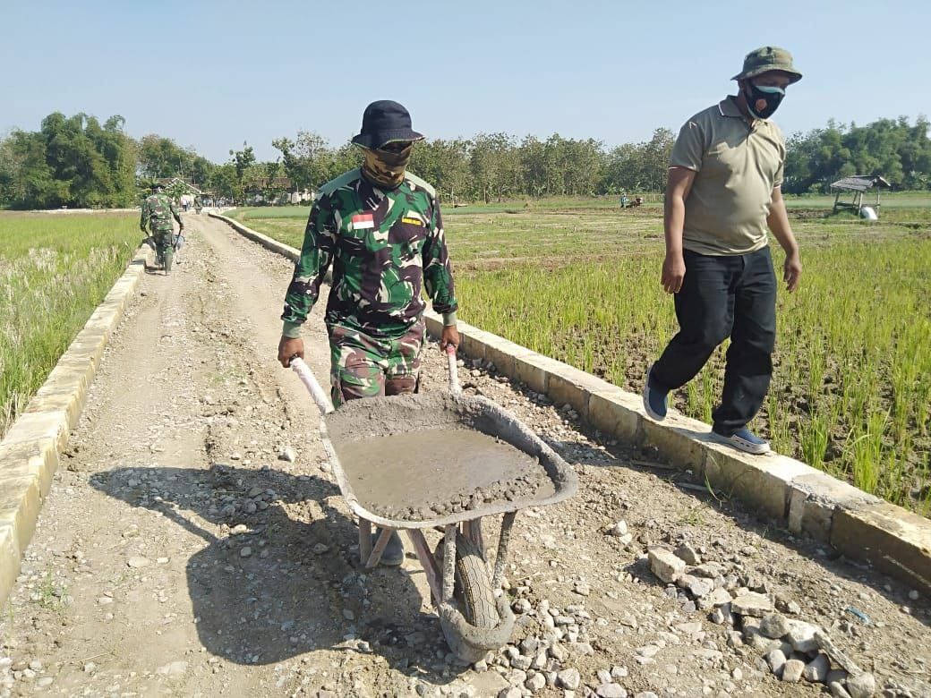 Tanpa mengenal rasa lelah, prajurit TNI tergolong dalam satgas TMMD, melanjutkan pengecoran jalan tembus dua desa, yakni Desa Tamansari dan Desa Sumberejo.