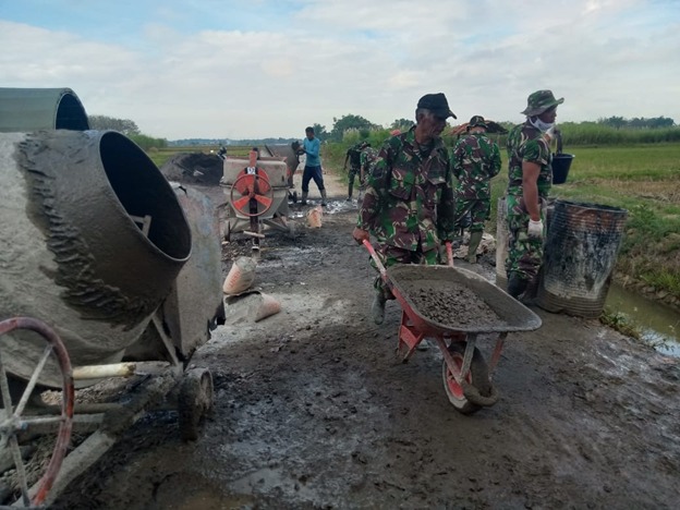 PATI – TNI Manunggal Membangun Desa (TMMD) Reg 111 Kodim 0718/Pati di Desa Tamansari memfokuskan pekerjaan pengecoran jalan yang menghubungkan ke Desa Sumberarum, Kecamatan Jaken, Kabupaten Pati, Minggu (27/06/2021).