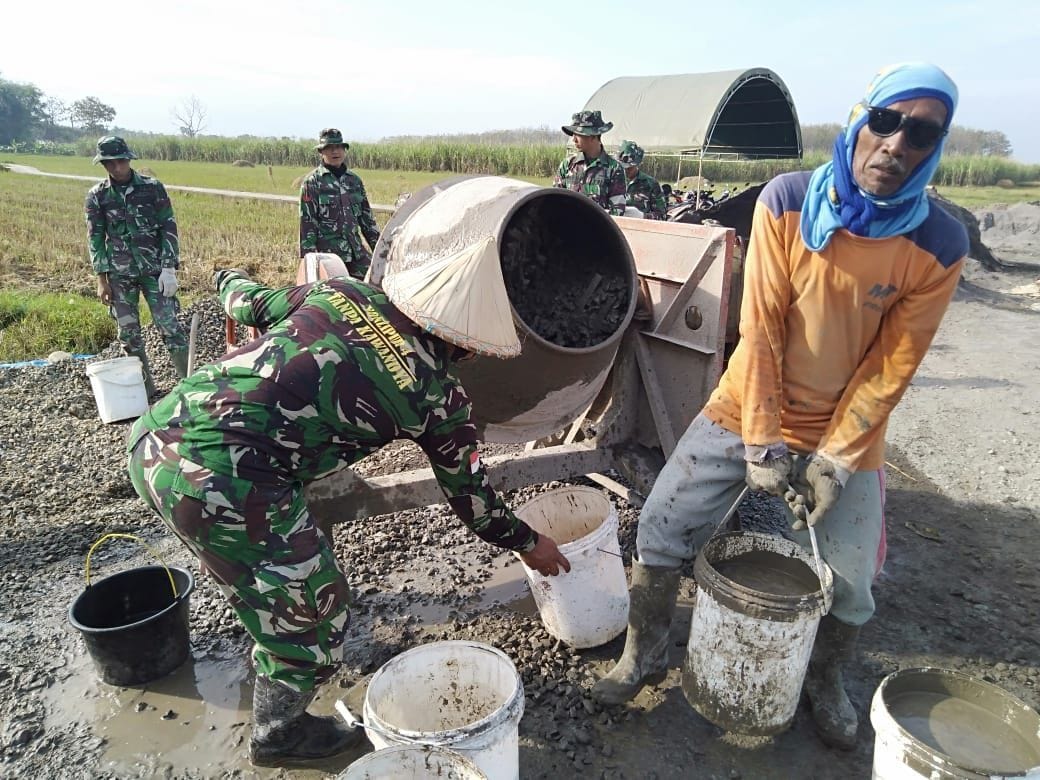 Pati – Pacu semangat satgas TMMD menggunakan alat berupa mesin pengaduk semen beton atau istilahnya adalah Mesin Molen Beton sangat membantu mempercepat pekerjaan pembangunan betonisasi jalan yang dikerjakan oleh Satgas TMMD Ke-111 Kodim 0718/Pati, di Desa Tamansari, Kecamatan Jaken, Kabupaten Pati.