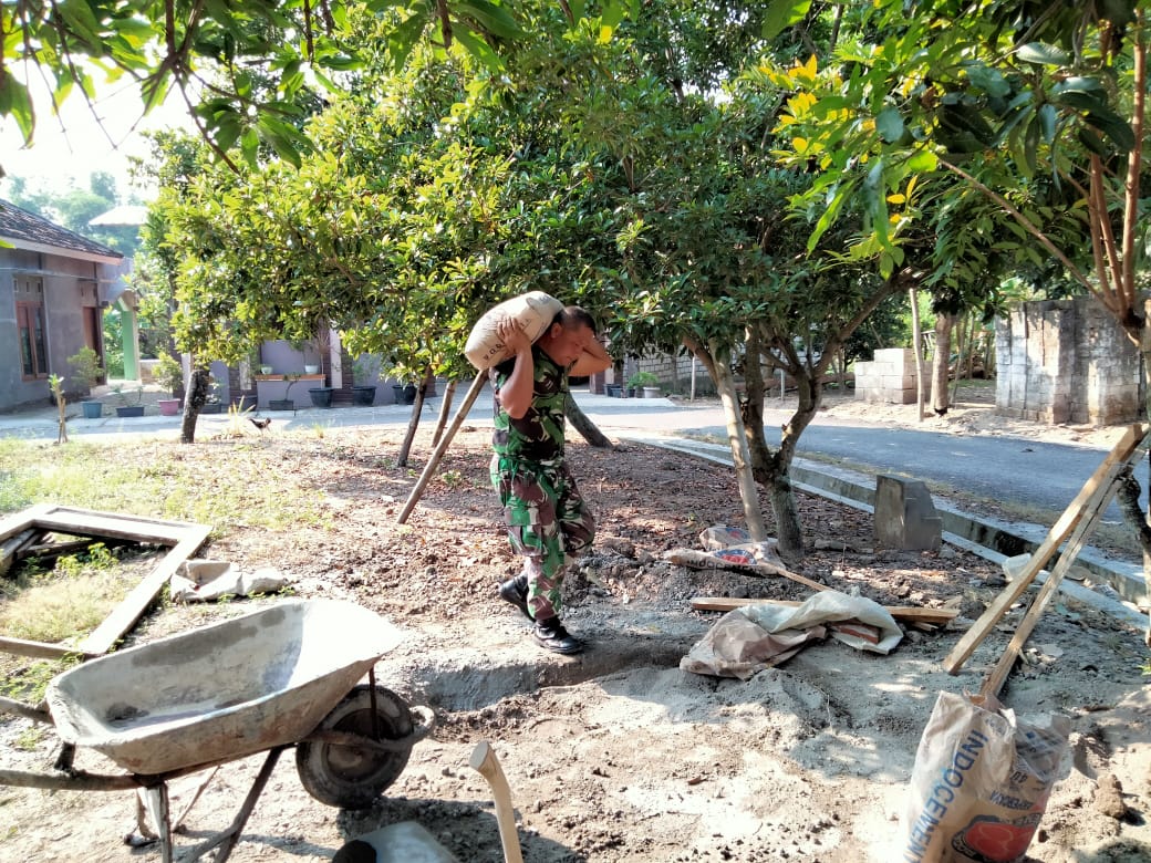 Serda Sugiyanto, salah seorang anggota Satgas TMMD, terlihat masih semangat memanggul semen dalam membantu proses pengerjaan rehab RTLH.