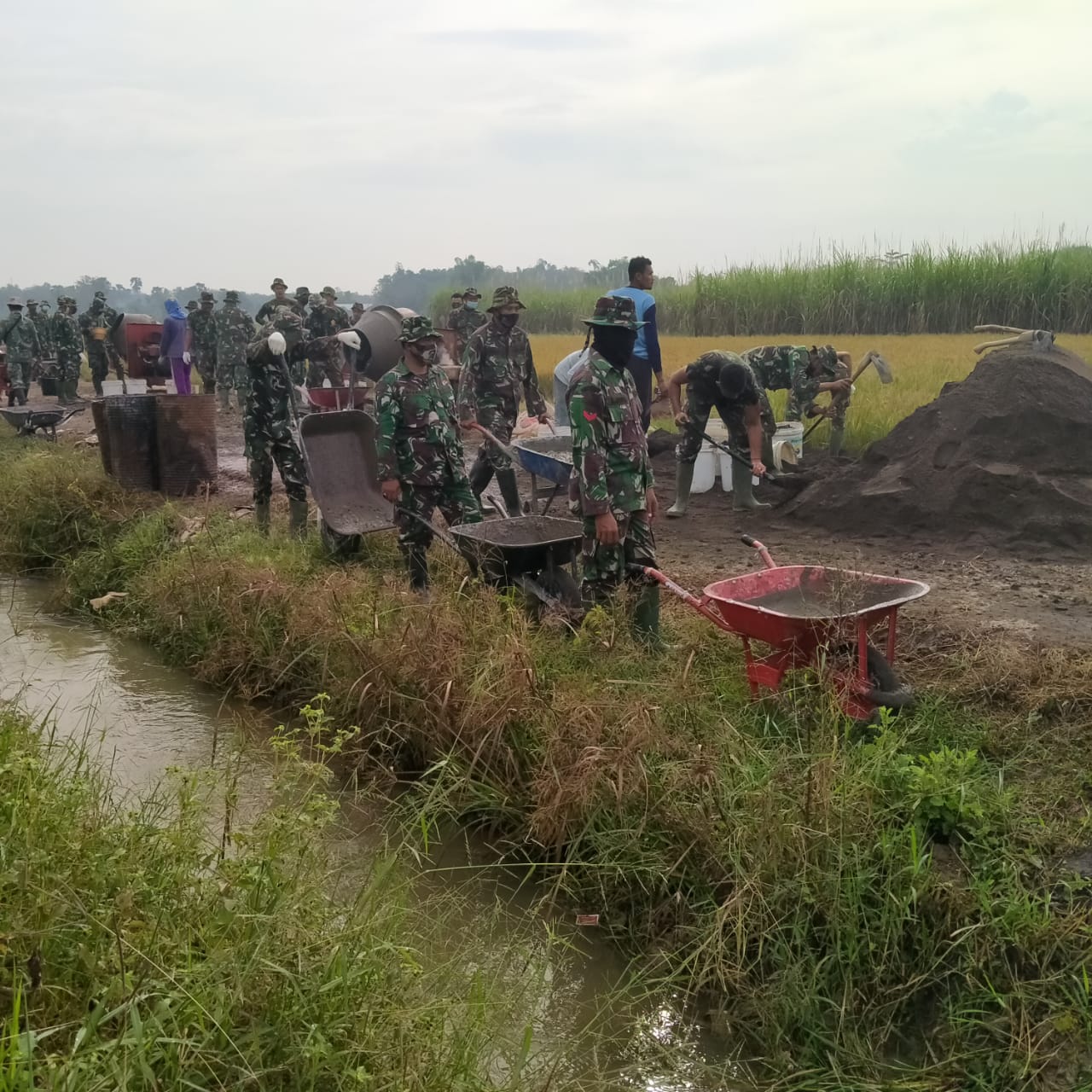 Pati – Satgas TNI Manunggal Membangun Desa (TMMD) ke 111 Kodim 0718/Pati dan warga terus bekerja dengan keras untuk menyelesaikan program betonisasi pembangunan jalan yang berada di Desa Tamansari Kecamatan Jaken Kabupaten Pati. Rabu,(23/06/2021).