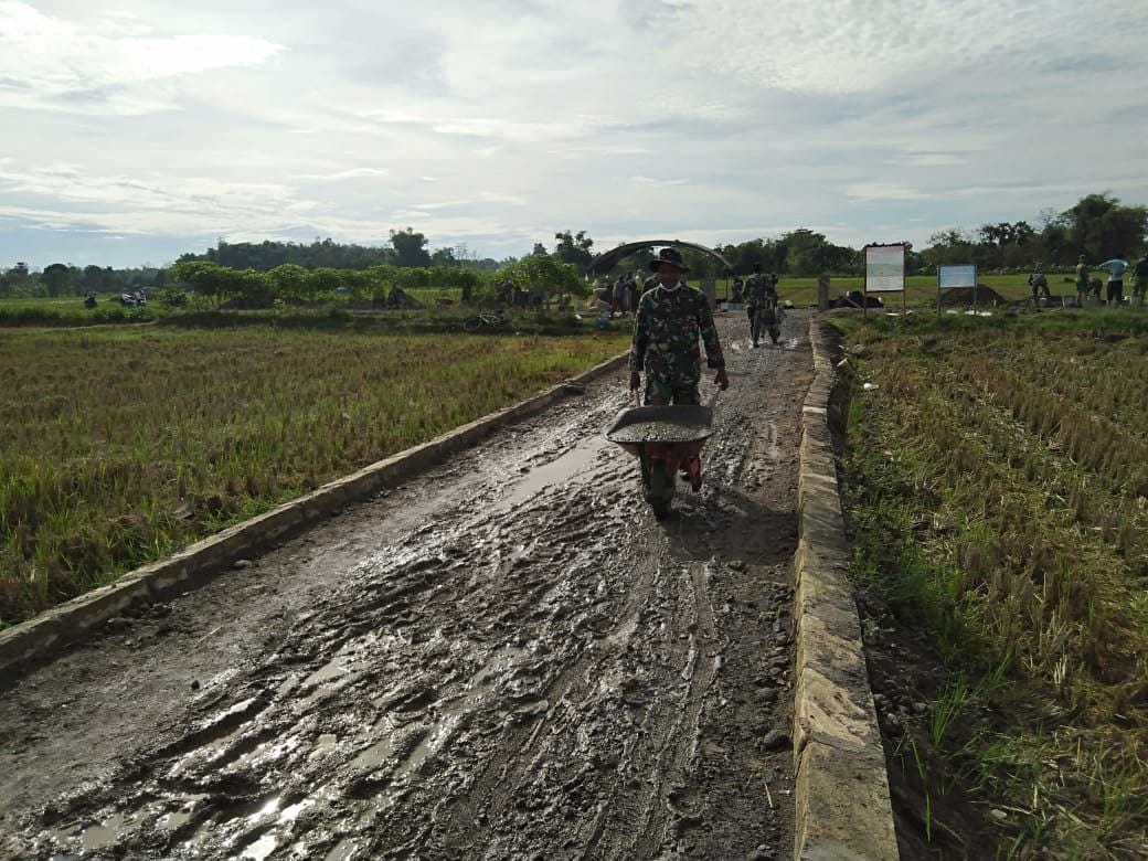 Ya itulah yang di lakukan salah satu anggota satgas TMMD Reguler ke 111 Kodim 0718/Pati, Serda Muslim (40) dengan semangat dan sabar mengantarkan adukan cor dari tempat molen ke sasaran pengecoran, ya agak lumayan kurang lebih 300 meter, saat melalui jalan becek, atau Lumpur, hanya gerobaklah yang bisa digunakan untuk mengerjakannya.