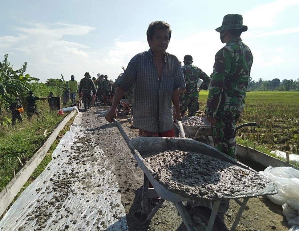 gotong royong membantu pengecoran jalan yang sedang dikerjakan oleh Satgas TMMD.