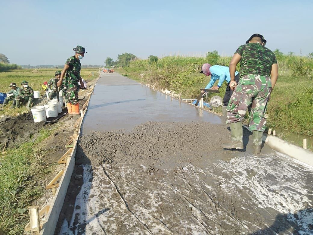 Tanpa mengenal rasa lelah, prajurit TNI tergolong dalam Satgas TMMD, melanjutkan pengecoran jalan tembus dua desa, yakni DesaTamansari dan Desa Sumberarum.