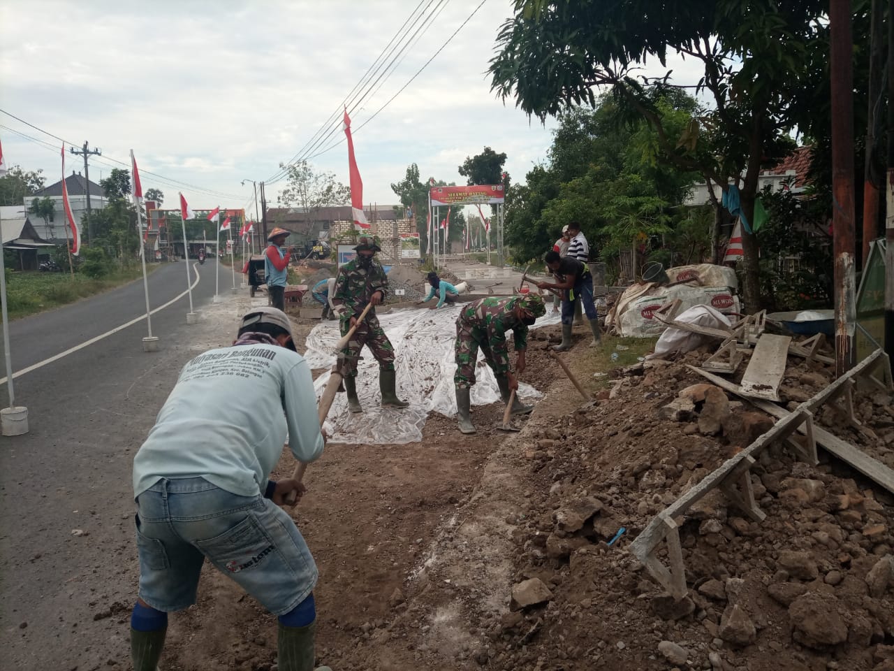 Anggota Satgas TMMD Reguler 111 bersama Masyarakat desa bergotong royong melakukan penggalian tanah dilokasi rabat beton jalan penghubung antara Desa Sumber Arum dengan Desa Tamansari, Kecamatan Jaken, Kabupaten Pati.