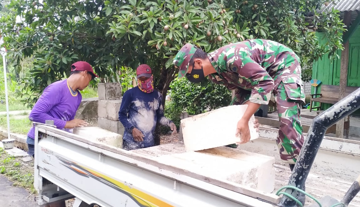 Namun TNI anggota Satgas TMMD Reguler Kodim Pati terus saja membantu warga masyarakat yang perlu dibantu. Serda Subakir salah satu anggota Satgas TMMD terlihat sedang membatu warga menurunkan batu Kumbung dari atas mobil pengangkut yang akan digunakan bahan pondasi pembangunan rumah salah seorang warga,