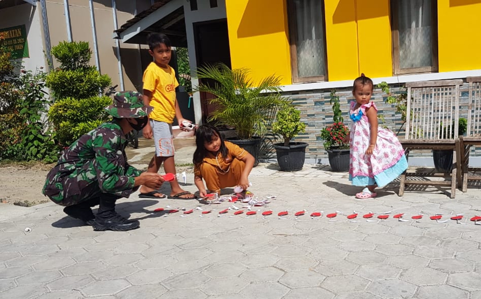 Seperti terlihat kali ini, Serda Sukarji anggota Satgas TMMD sedang mengajari anak-anak membuat layang-layang di depan rumah warga. Berbekal pengalaman waktu kecil, Serda Sukarji membantu anak-anak membuat layang-layang bagus dan benar sehingga bisa diterbangkan dengan baik dan sempurna.