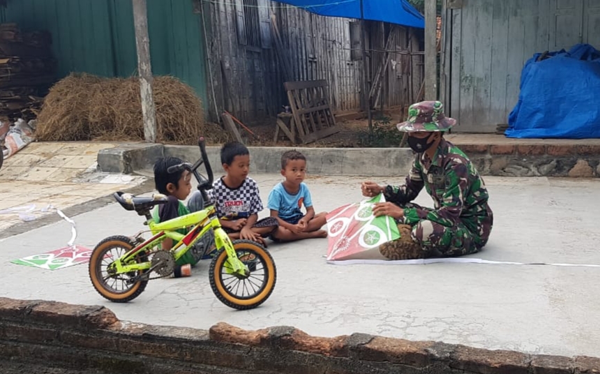 Seperti terlihat kali ini, Serda Sukarji anggota Satgas TMMD sedang menghampiri anak-anak yang sedang memasang tali pangkal pada layang-layang di depan rumah warga. Berbekal pengalaman waktu kecil, Serda Sukarji membantu anak-anak membuat dan memasang tali benang pada kerangka layang-layang.
