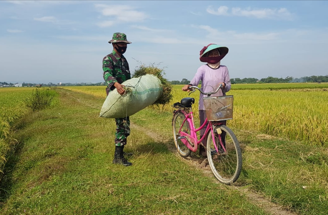 Seperti terlihat kali ini, Serda Sukarji anggota Satgas TMMD Reguler Kodim Pati sedang membatu Ibu Suparni (52) warga Dukuh Kalimati, Desa Tamansari, Kecamatan Jaken, Kabupaten Pati, mengangkat karung berisi rumput ke atas sepedanya