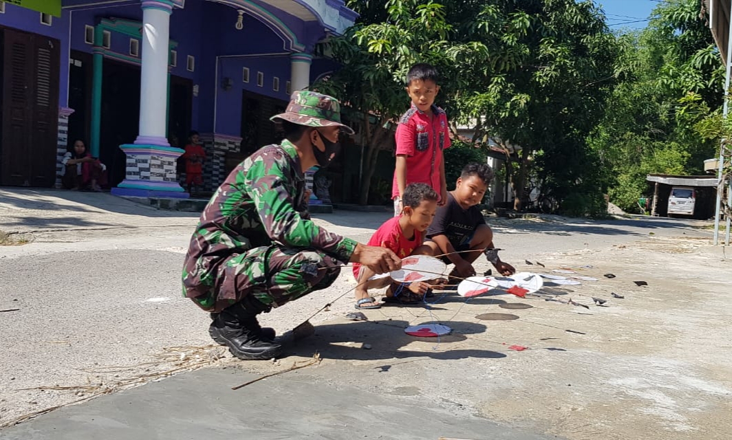 Seperti terlihat kali ini, Serda Sukarji anggota Satgas TMMD sedang menghampiri anak-anak yang sedang membuat layang-layang di depan rumah warga. Berbekal pengalaman waktu kecil, Serda Sukarji membantu anak-anak membuat kerangka layang-layang, Kamis (08/7/2021).