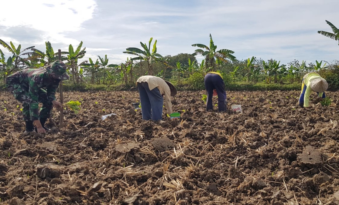 Telihat anggota satgas TNI Manunggal Membangun Desa (TMMD) ke-111 Kodim Pati sedang membantu Sartini (44) warga Dukuh Kemiri RT.02/02 Desa Tamansari Kecamatan Jaken. Serda Sukarji membantu memasukkan bibit jagung ke dalam lubang yang telah dibuat dengan menggunakan alat tradisional dari sebatang kayu, Senin (28/6/2021).