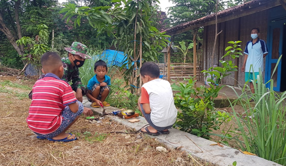 Pati – Sebagai bentuk simpati dan senang dengan anak-anak, Serda Sukarji salah satu anggota Satgas TMMD Reguler ke-111 Kodim 0718/Pati menyempatkan diri untuk bermain bersama anak-anak di pagi hari sebelum berangkat ke lokasi pengecoran jalan sasaran fisik TMMD, Kamis (24/6/2021).