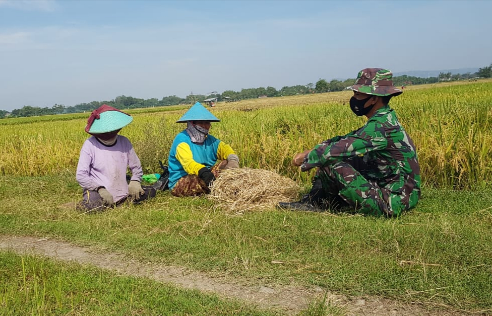 Pati – Serda Sukarji anggota Satgas TMMD Reguler ke-111 Kodim 0718/Pati terlihat sedang ngobrol bersama emak-emak di jalan persawahan Dukuh Kalimati, Desa Tamansari, Kecamatan Jaken, Kabupaten Pati, tempat digelarnya kegiatan TMMD Reguler Kodim Pati Tahun Anggaran 2021.