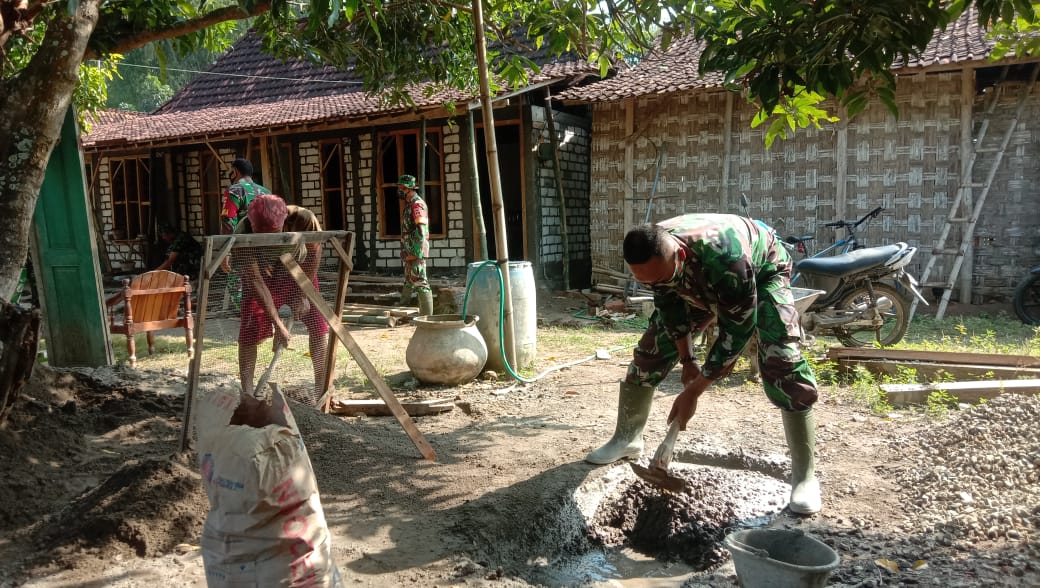 Salah satu personel tersebut adalah serda Sutrisno yang terlihat mahir dalam aduk mengaduk adonan semen bercampur dengan pasir di rehab rumah tidak layak huni (RTLH) milik Syukur salah satu warga yang menerima bantuan.Jumat,(11/06/2021).