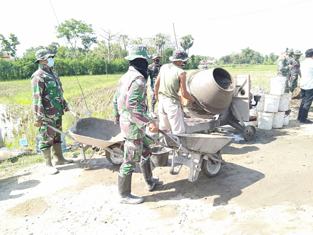 Pati-Program TMMD reguler Kodim 0718/Pati di desa Tamansari kecamatan Jaken kabupaten Pati tengah berjuang menyelesaikan sasaran fisik betonisasi jalan dan rehab rumah tidak layak huni (RTLH).
