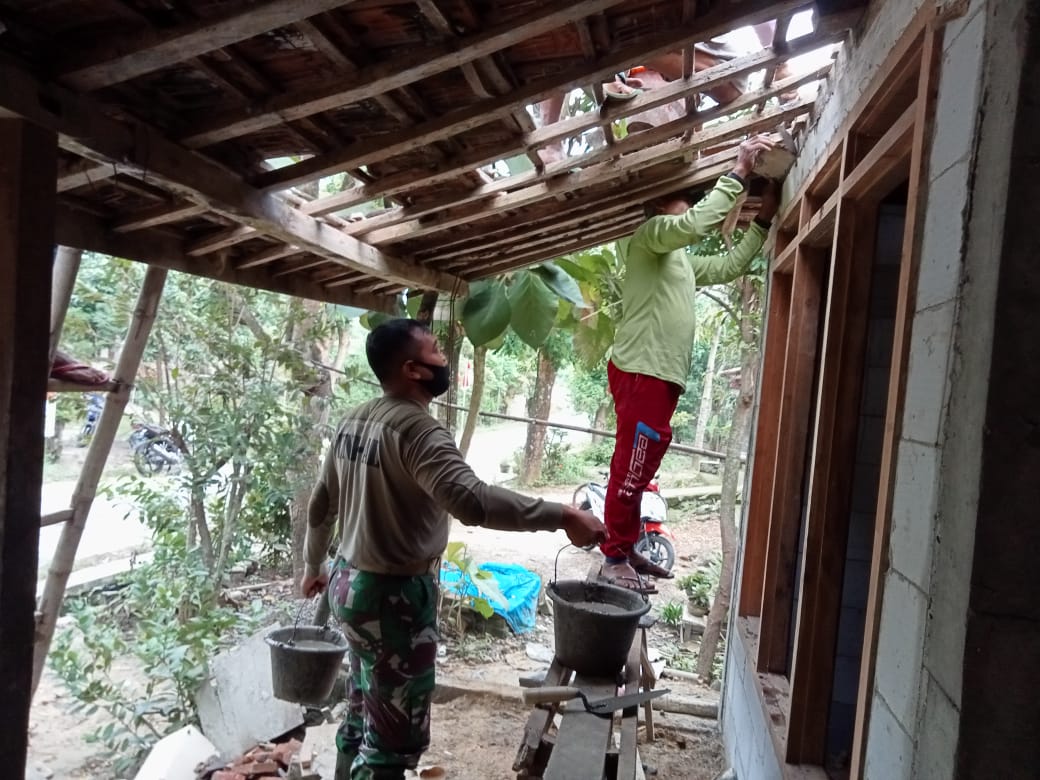 “Kita bantu pembenahan atap dirumah bu Sripi karena sering bocor,sekaligus ini tadi ngecor ring atas tembok depan,”ujar Serda Jatmiko.