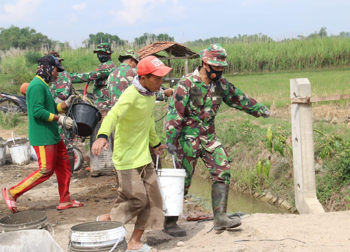 Seperti terlihat kali ini, Serka Joko Soetanto bersama Darminto (30) warga setempat sedang mengangkat ember berdua. Mereka terlihat kompak dengan langkah yang sama menuju kendaraan pengangkut adonan cor dan melangsirnya ke titik pengecoran.