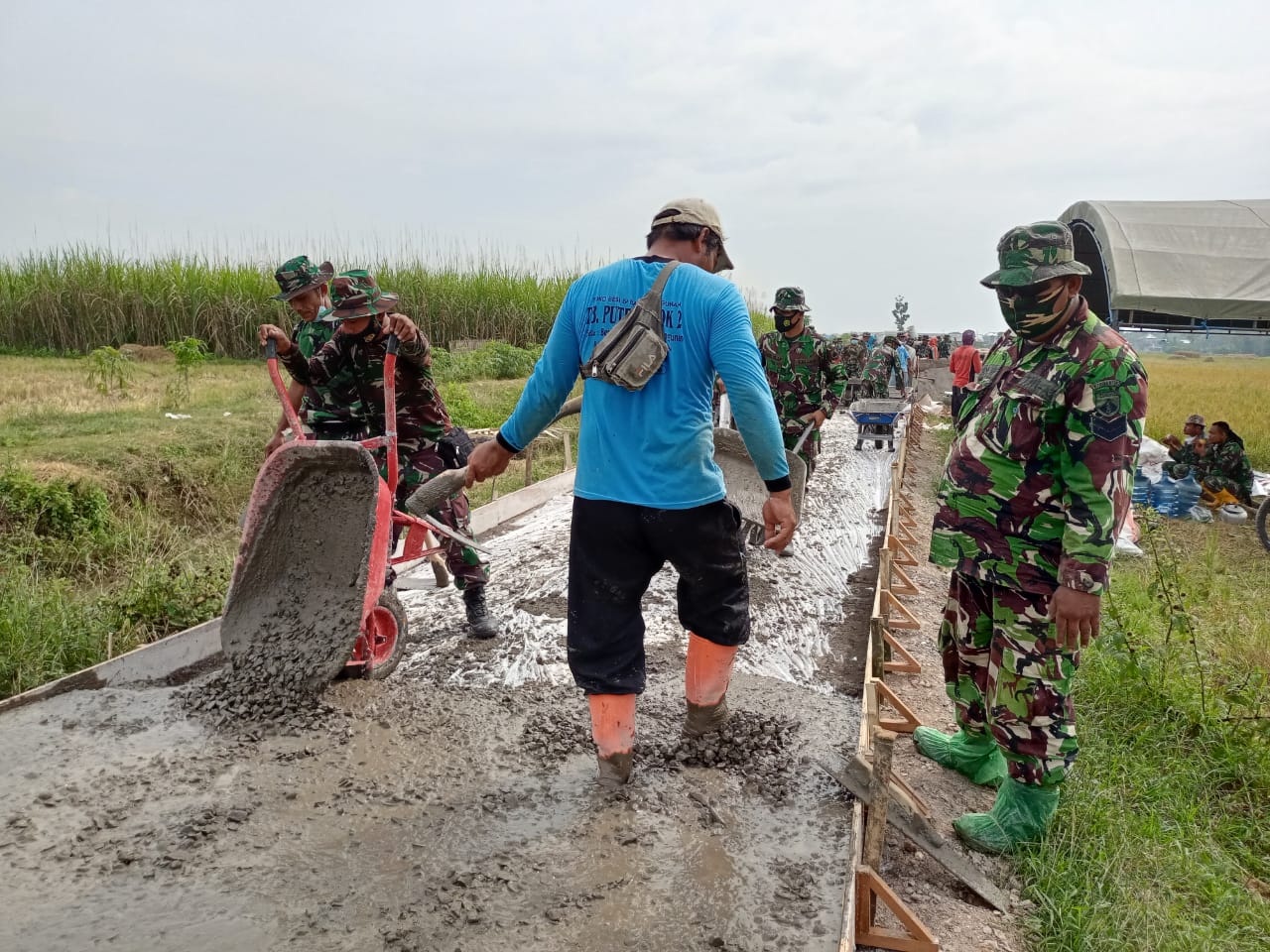 Pati – Dalam pengerjaannya sebagian jalan betonisasi pada pembangunan jalan TMMD reguler 111 Kodim Pati yang menjadi sasaran pokok sudah terlihat hasilnya, dari rencana yang akan dibangun sepanjang 1450 meter, yang merupakan jalan penghubung antara Desa Tamansari menuju Desa Sumberarum. TNI dan masyarakat terus kebut pekerjaan tersebut.