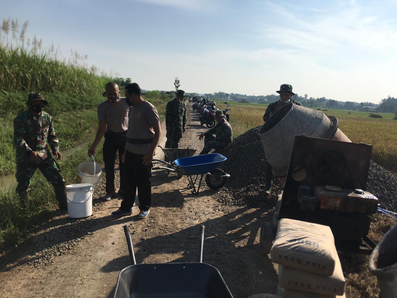 Pati – TNI Manunggal Membangun Desa (TMMD) reguler ke 111 Kodim 0718/Pati dalam pekerjaan pengecoran jalan betonisasi yang merupakan sasaran pokok, tampak TNI dan Polri berjibaku bersama masyarakat dalam pekerjaan tersebut.