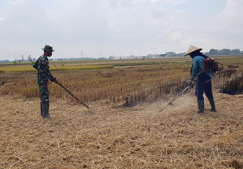 Serda Sukarji, dialah TNI anggota Satgas TMMD yang sedang membantu Bapak Sarmidi memotong batang padi yang masih tersisa. Menurutnya, hal ini dilakukan agar sisa batang padi tersebut tidak menggangu saat lahan ditanami tanaman jenis Palawija, seperti kacang hijau, kedelai atau yang lainnya.