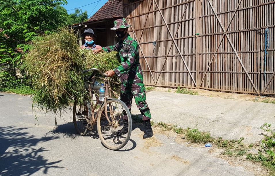Seperti terlihat kali ini, Bapak Sudirman (48) warga Dukuh Pandahan RT.03/03, Desa Tamansari, Kecamatan Jaken, Kabupaten Pati sedang menata rumput yang diboncengkan di atas sepeda onthelnya dengan dibantu Serda Sukarji anggota Satgas TMMD Reguler ke-111 Kodim 0718/Pati, Kamis (08/7/2021).