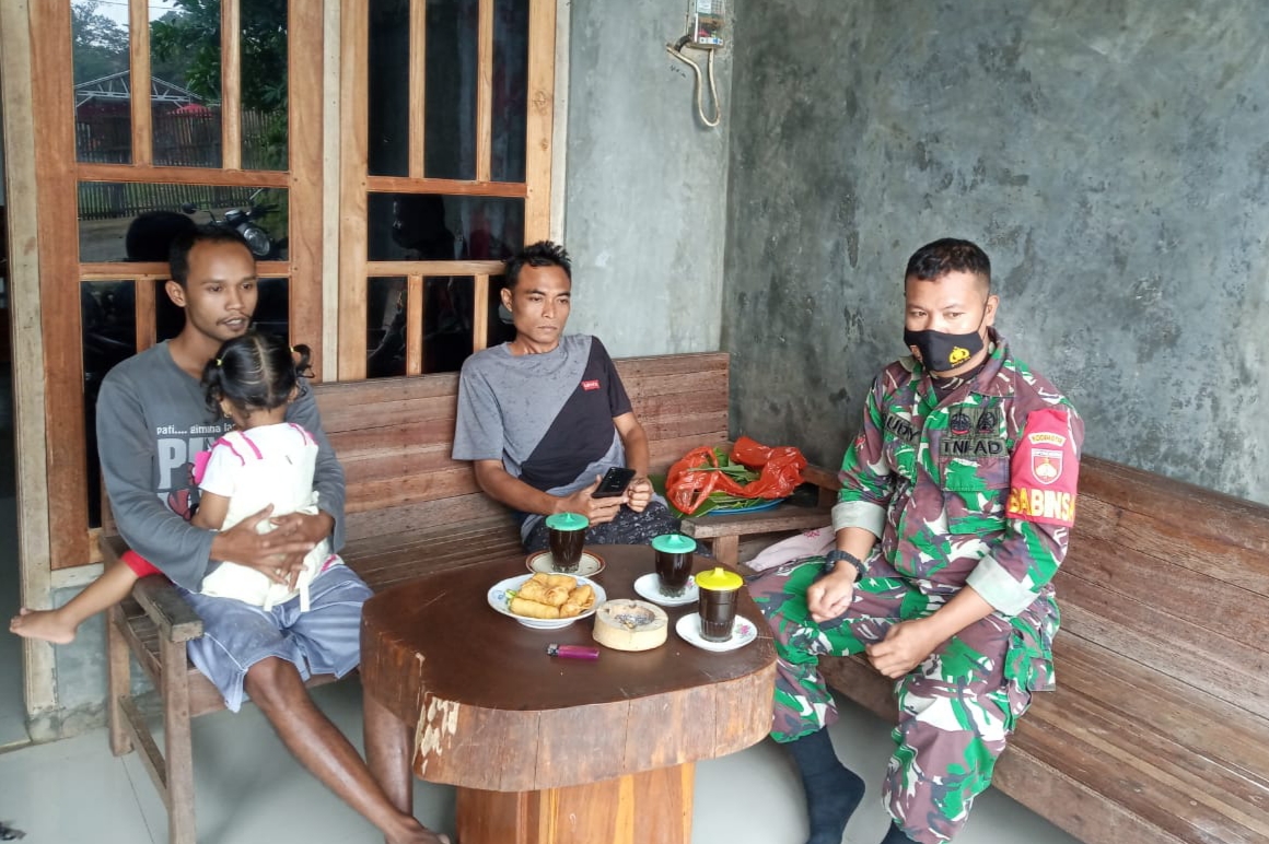 Seperti terlihat saat ini, Kopral satu Rudianto anggota Satgas TMMD Reguler ke-111 Kodim Pati sedang bertamu di rumah Bapak Ngadirin (42) warga Dukuh Kalimati, Desa Tamansari, Kecamatan Jaken, Kabupaten Pati, Kamis (08/7/2021).