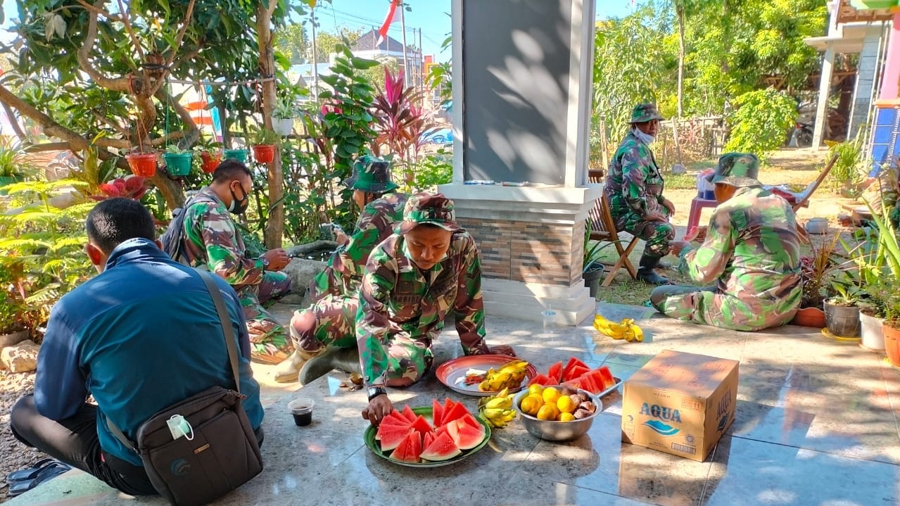 Pati – Dalam kesempatan istirahat sejenak sambil memulihkan tenaga, satgas TMMD reguler ke 111 Kodim0718/Pati dan warga mendapat dukungan hidangan makanan dan minum dari warga yang teras rumahnya digunakan untuk istirahat sambil berteduh, Rabu (07/07/2021).