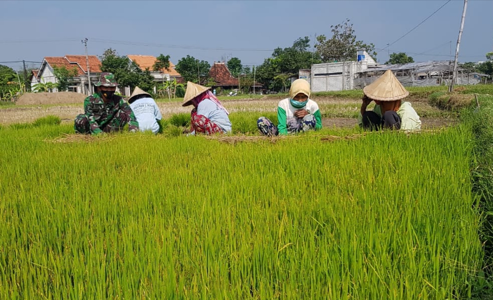 Seperti terlihat saat ini, Serda Sukarji anggota TMMD Reguler Kodim Pati sedang membantu Bapak Sukirno (56) warga Dukuh Pandahan, Desa Tamansari, Kecamatan Jaken, Kabupaten Pati, yang sedang mencabut bibit padi yang akan ditanam dilahan sawah miliknya tidak jauh dari lokasi pengecoran jalan pertanian sasaran fisik TMMD, Senin (05/7/2021).