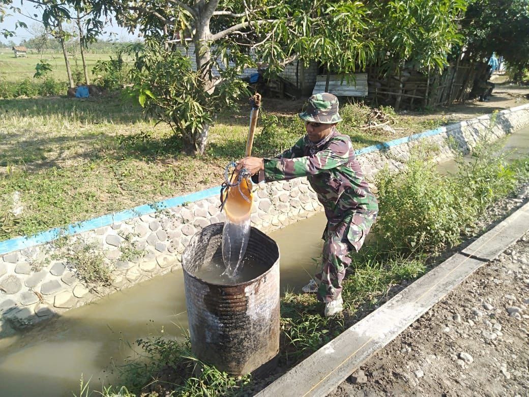 Pati – Air merupakan bahan yang sangat penting untuk membuat adukan cor dalam proses pembuatan pembangunan betonisasi sepanjang 1.450 meter di Desa Tamansari Kecamatan Jaken Kabupaten Pati, dalam program TMMD Reguler ke- 111 Kodim 0718/Pati.