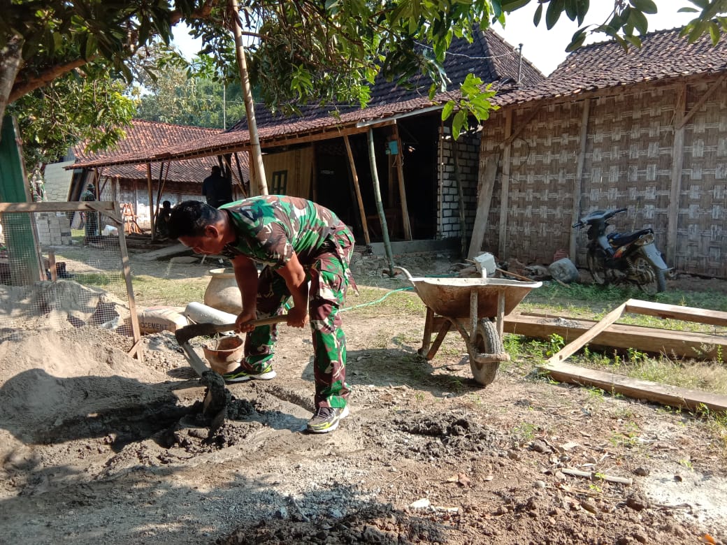 Sertu Toha Untoro (40) tampak terlihat sedang mengaduk semen, dalam pekerjaan ini harus tahu bagaimana takaran pasir dan semen dan cara mencampurnya sehingga menghasilkan adukan semen yang baik untuk pasangan bata atau plesteran menjadi kuat.