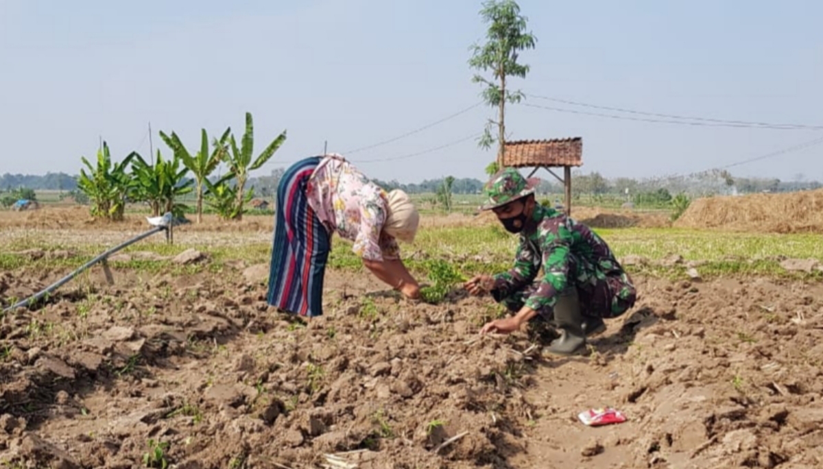 Pati – Pagi itu, Serda Sukarji salah satu personil Satgas TMMD Reguler ke-111 Kodim 0718/Pati terlihat sedang membantu masyarakat menyelesaikan penanaman cabai di lahan kebun milik Ibu Marfu’ah (53) warga Dukuh Kalimati RT.02/03, Desa Tamansari, Kecamatan Jaken, Kabupaten Pati.