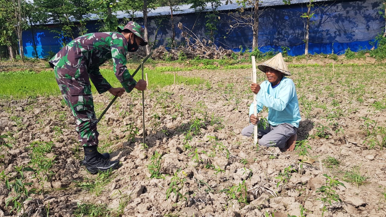 Pati – Tampak Serda Sukarji anggota Satgas TMMD Reguler ke-111 Kodim 0718/Pati ketika usai bekerja dari sasaran fisik TMMD, yakni pengecoran jalan pertanian sepanjang 1.450 meter, sedang membantu Bapak Sarjono dalam kegiatan pengajiran tanaman cabainya.